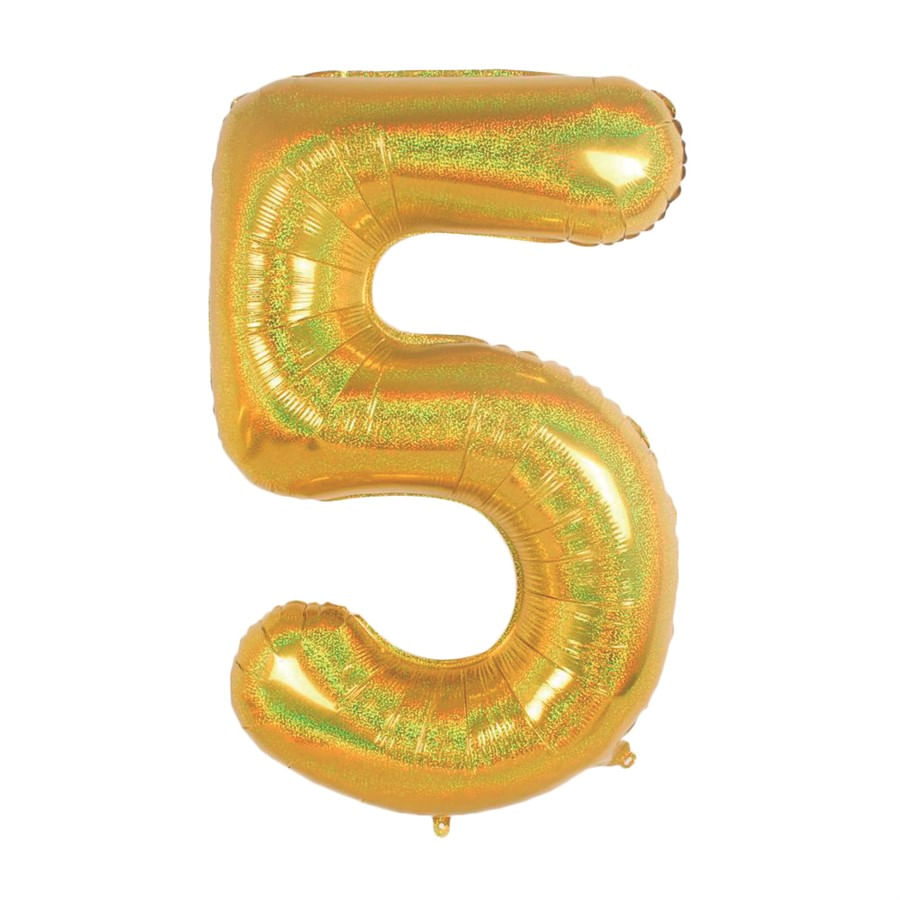 O Balão Metalizado Número 5 Holográfico Glitter Ouro é perfeito para deixar qualquer festa ainda mais especial. Ele mede 101cm de altura e 67cm de largura, ou 40 polegadas. A cor do produto é ouro e a estampa é N.° 5 holográfico glitter.