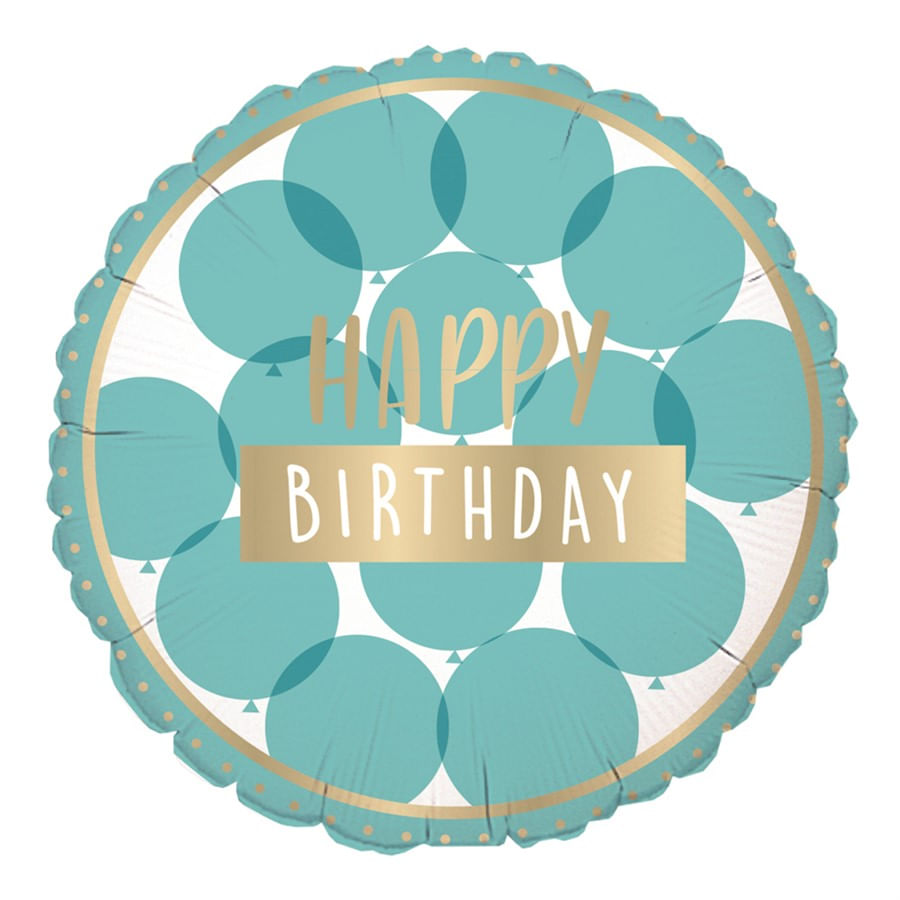 O Balão Metalizado Redondo Happy Birthday Azul Claro e Dourado 18'' pertence à categoria de balões metalizados e é um produto redondo.