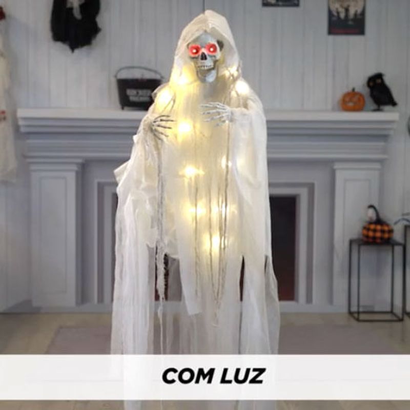 Assuste seus convidados no Halloween com o Boneco Halloween Ceifador Branco com Luz - Cromus!