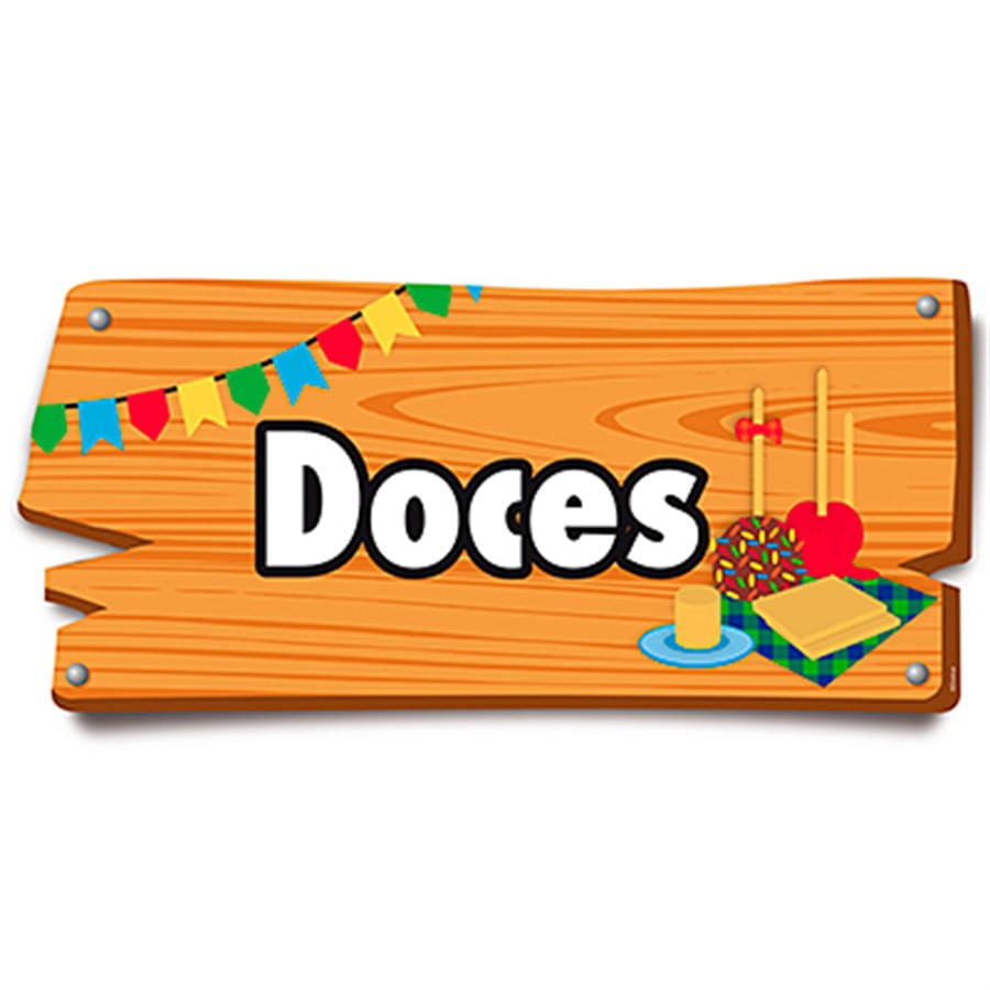 A Placa de Sinalização Doces é perfeita para sinalizar o local dos doces na festa junina. Com design temático, ela é feita em material resistente e tem tamanho ideal para ser vista de longe.