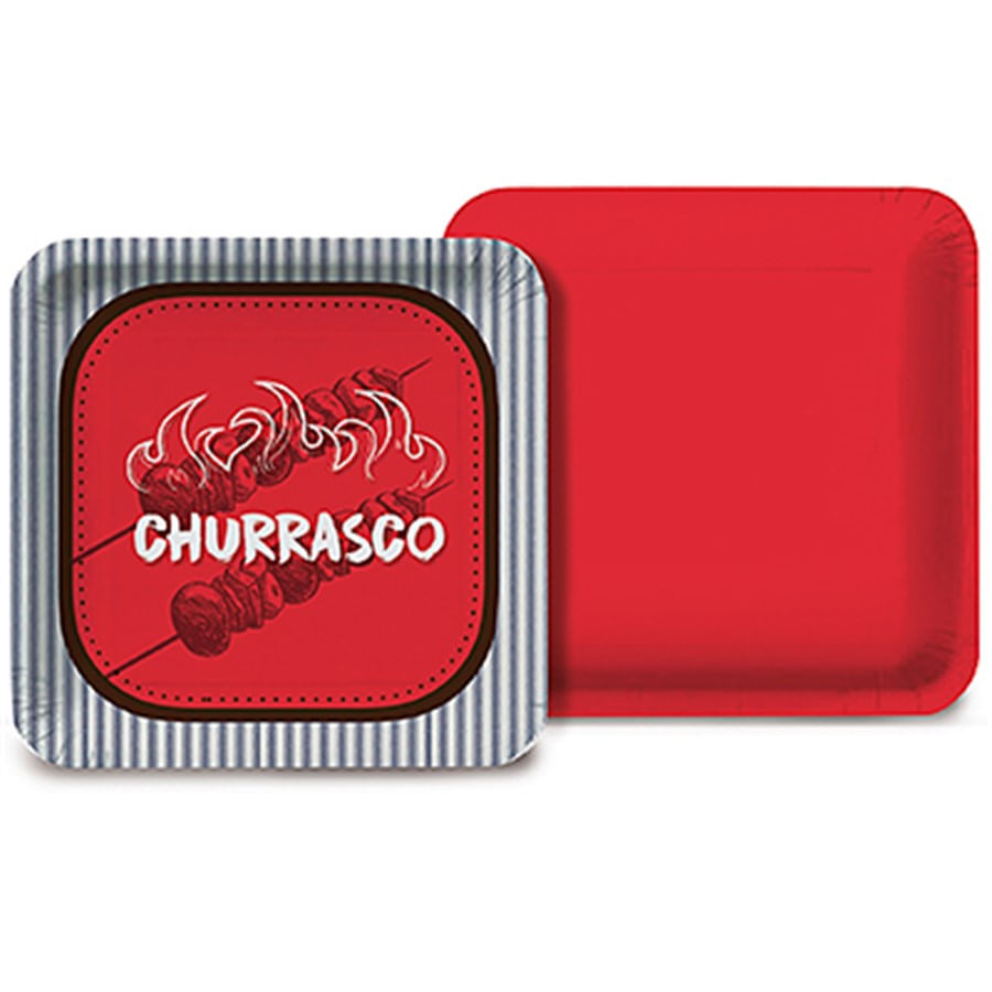 Os pratos são feitos de material resistente de Cartão + Pigmento Colorido e possuem medidas aproximadas de Largura: 18cm e Comprimento: 18cm. O pacote possui 8 unidades de Pratos Quadrados 18cm para você servir churrasco.