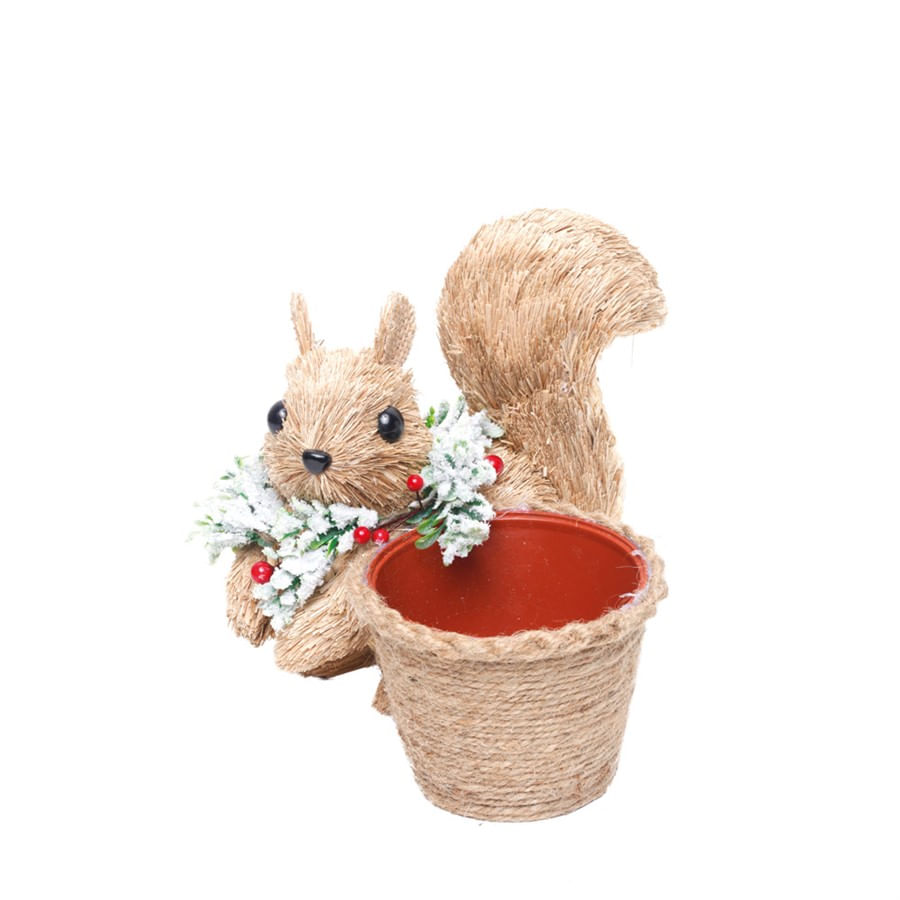 Cromus - Esquilo crespinho decorativo com folhas nevadas em volta do pescoço. Sentado ao lado de um cachepot. Tamanho P