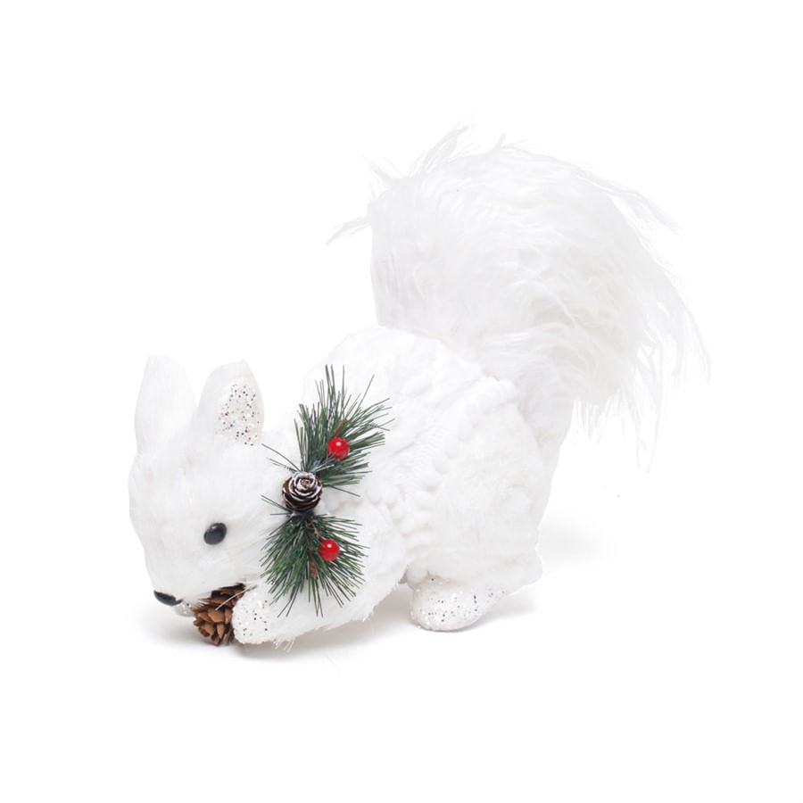 Cromus - Esquilo decorativo branco de algodão sentado segurando nozes com enfeite de folhas e frutas no pescoço. Tamanho M