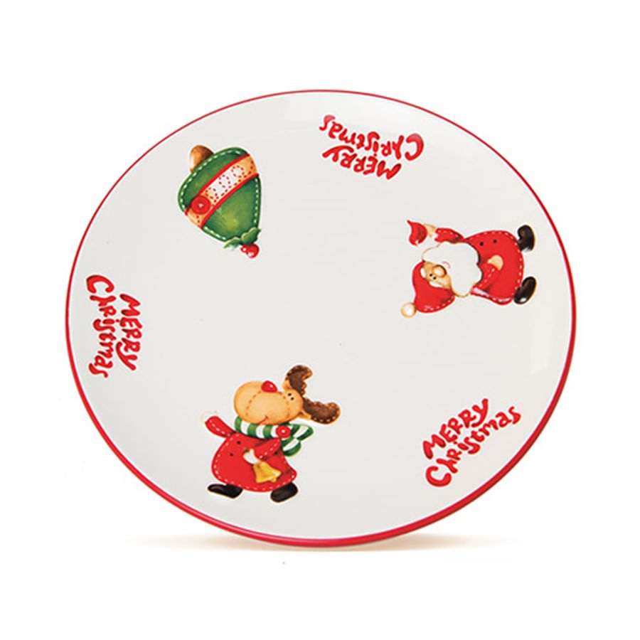 Esse prato de cerâmica branco com borda vermelha possui um desenho encantador de Noel, árvore e rena. Suas medidas são: Diam. 23,00.