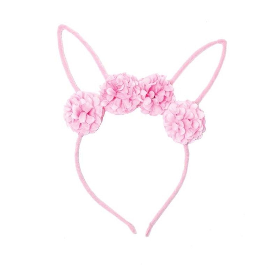 Design encantador com orelhas de coelho e flores rosa, perfeito para festas temáticas e fantasias;