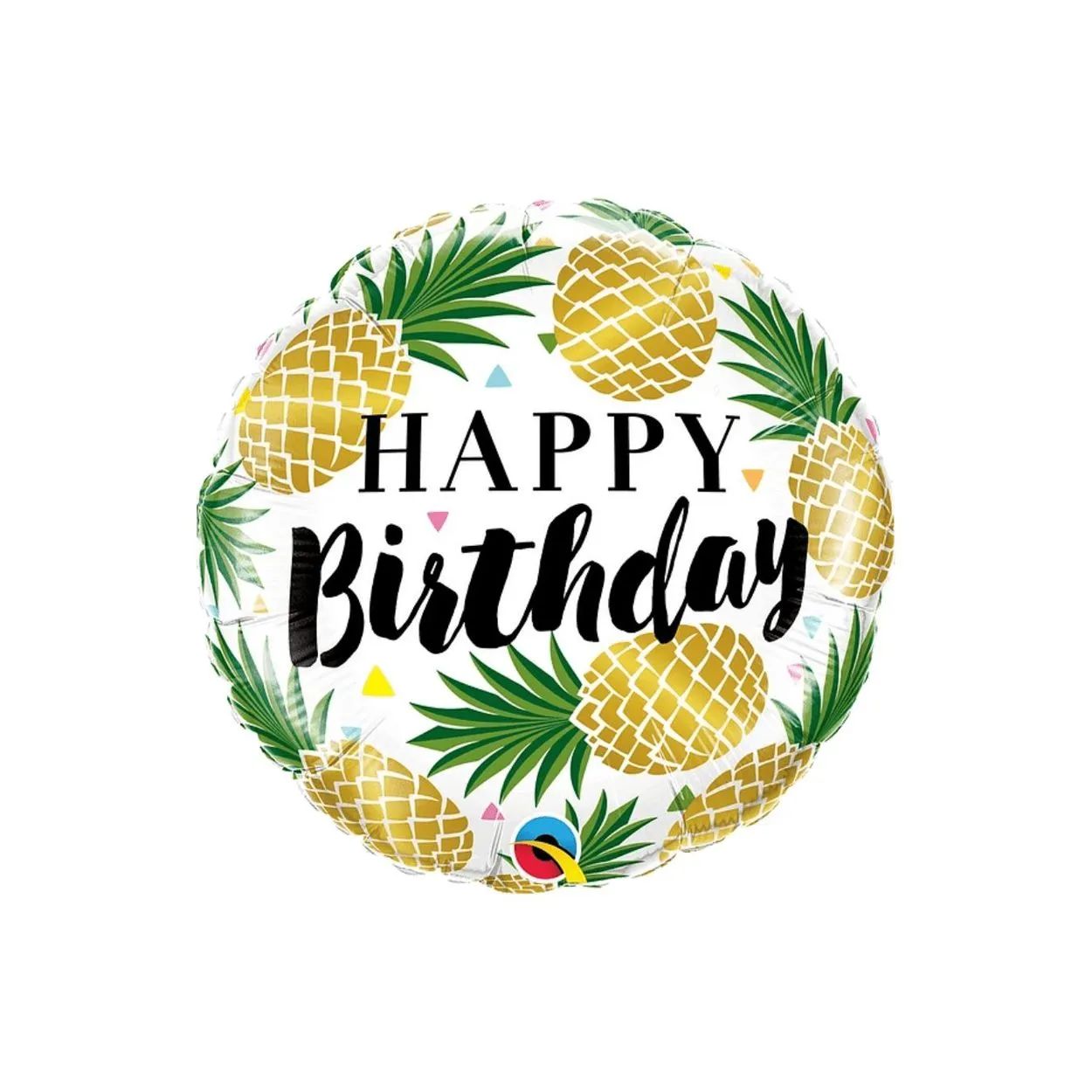 O Balão Qualatex 18" - Redondo - Birthday-Abacaxís Dourados é a escolha perfeita para dar um toque especial às suas festas de aniversário. Com sua durabilidade e resistência, este balão microfoil garante uma decoração impecável durante toda a comemoração. Seu design estampado com abacaxis dourados e a palavra "Birthday" trazem elegância e alegria ao ambiente festivo.