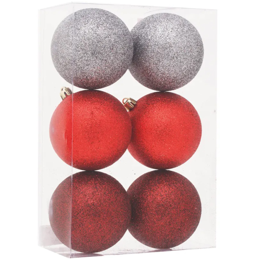 Bola de Natal Glitter Sortido Vinho, Vermelho e Cinza 8cm - 6 Un