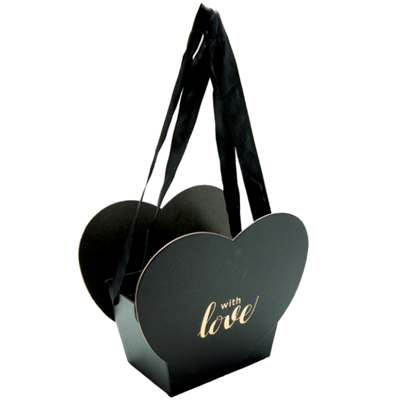 Caixa coração em papel preto com alça, perfeita para um toque de elegância em suas encomendas.