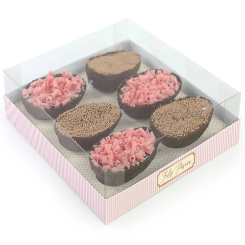 Caixa de degustação charmosa, ideal para 4 mini ovos de chocolate de 50g cada, na cor verde.