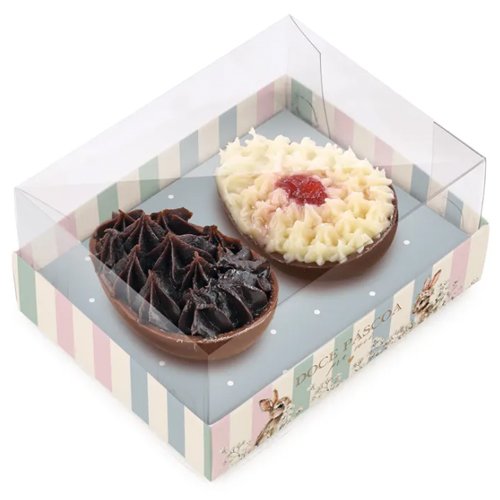 Caixa decorativa com ilustrações temáticas de Páscoa para embalar dois meios ovos de chocolate.