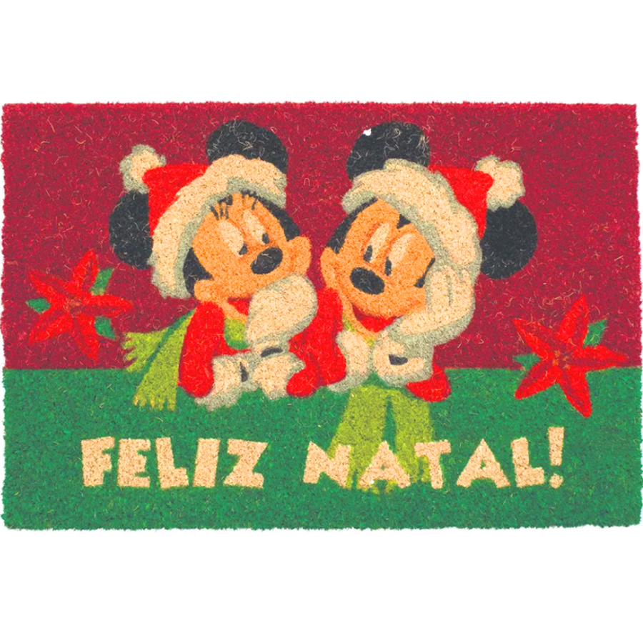 O capacho de fibra natural com o tema Mickey e Minnie "Feliz Natal" é uma peça encantadora para decorar a entrada da sua casa durante as festividades.