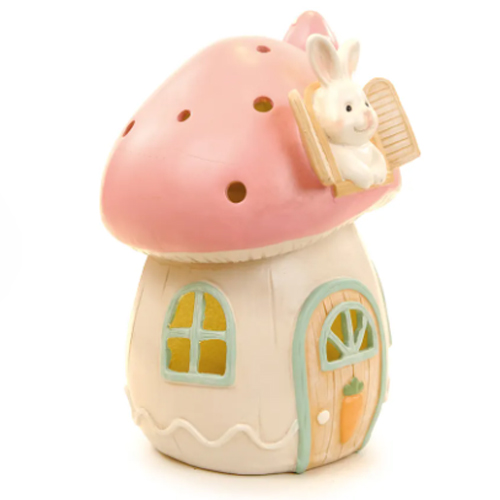 Casa decorativa em formato de cogumelo que conta com iluminação LED, perfeita para adicionar um toque mágico à decoração.
