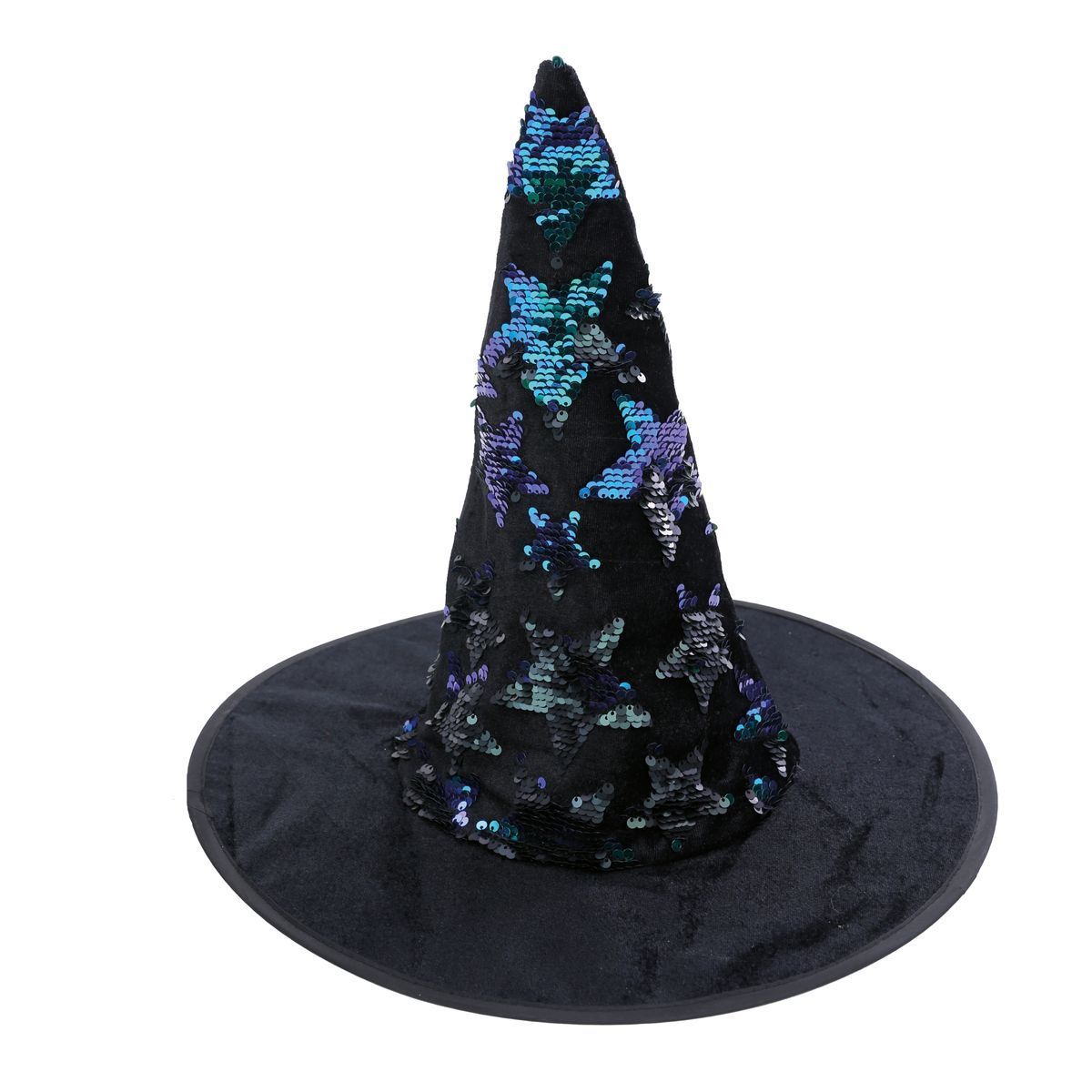 O chapéu é confeccionado com paetês verdes brilhantes, simulando a forma de uma estrela. Essa combinação de cores e texturas confere ao chapéu um aspecto elegante e festivo ao mesmo tempo, perfeito para completar a sua fantasia de Halloween.