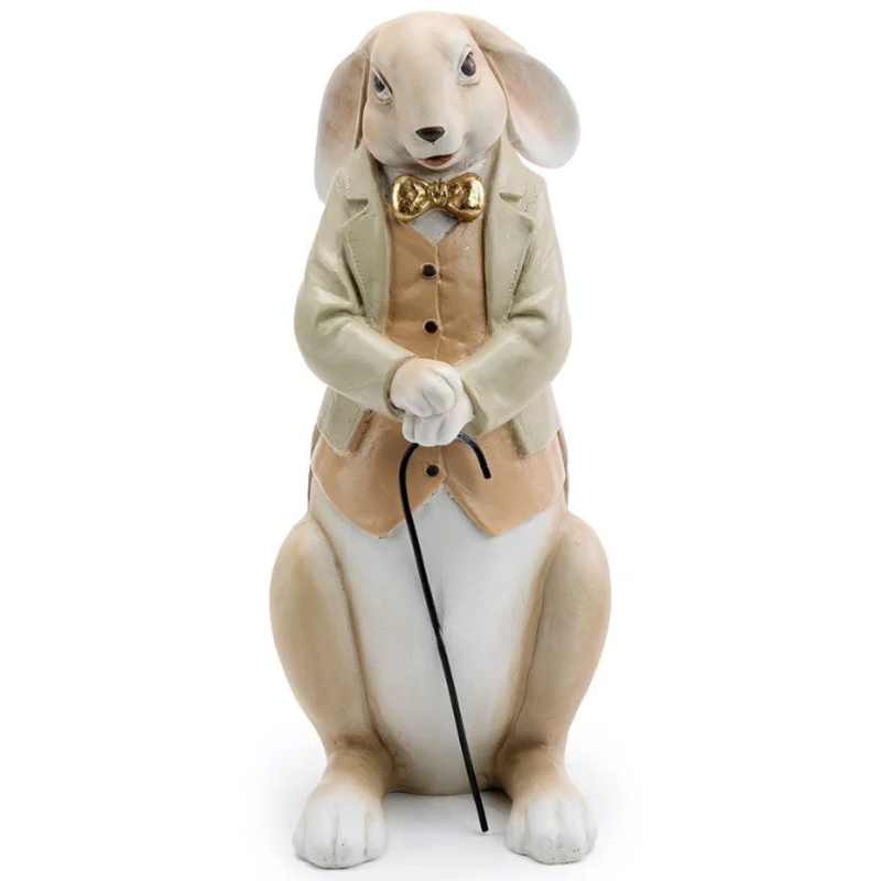 Coelho de resina elegante, vestido com smoking e segurando uma bengala, perfeito para decorações sofisticadas.
