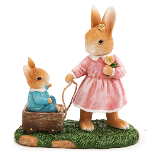 Coelho Decorativo em Resina Ternura com Filhote no Carrinho 13cm - 1 Un