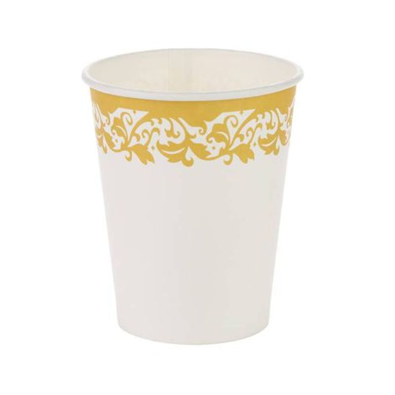 O Copo de Papel 270ml Borda Dourada da Silver Plastic é uma escolha versátil para servir diversas bebidas, garantindo praticidade e evitando a necessidade de lavagem de louça após o evento. Além disso, seu design sofisticado contribui para a estética da decoração.