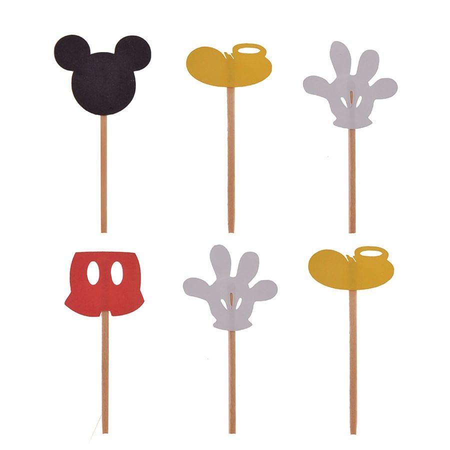 Fácil de usar: Basta espetar o palito de madeira nos docinhos e fazer com que a figura do Mickey fique visível.