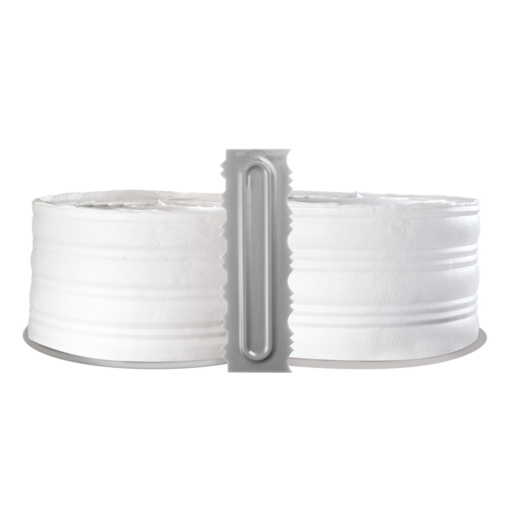 A Espátula Decorativa é um produto feito de material plástico resistente, que não deforma e produz a decoração de forma homogênea em toda circunferência do bolo. Com duas texturas diferentes na mesma ferramenta, cada lado da espátula produz uma decoração diferente e sofisticada.