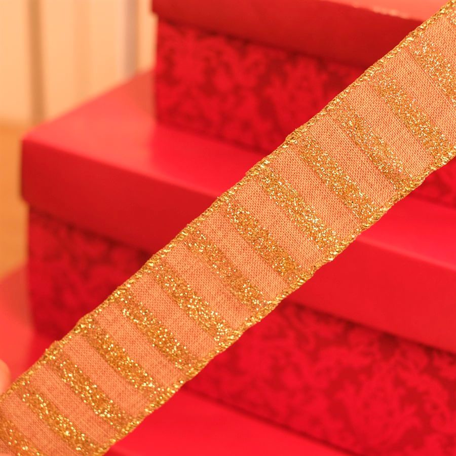 Utilize a Fita Juta Listras Natural e Ouro para amarrar embalagens de presentes, dando um toque especial aos seus presentes.