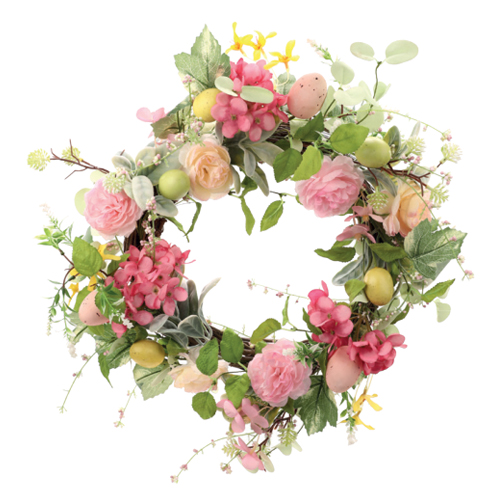 Guirlanda decorativa que combina flores e ovos, perfeita para embelezar portas e paredes durante a Páscoa.