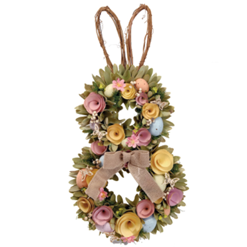 Uma guirlanda charmosa com a silhueta de um coelho decorado com flores em tons variados, perfeita para dar as boas-vindas na Páscoa.