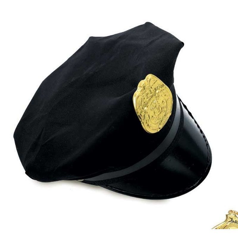 Kit composto por: chapéu estilo delegado, algemas cromadas, distintivo de metal e gravata preta