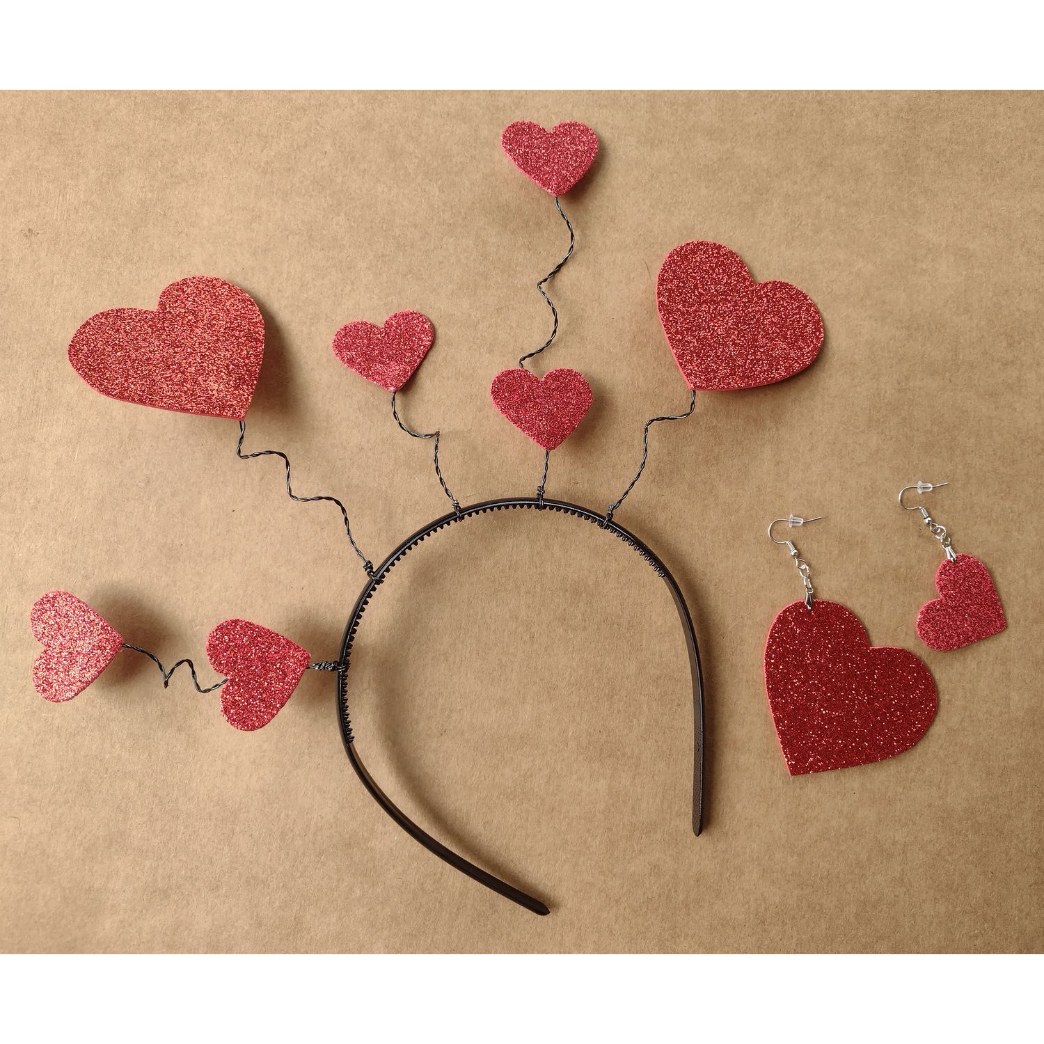 Material: Tiara de plástico flexível, decorada com corações de EVA com glitter suspensos. Brincos com aplique de corações de EVA com glitter. Cores e tamanhos variados.