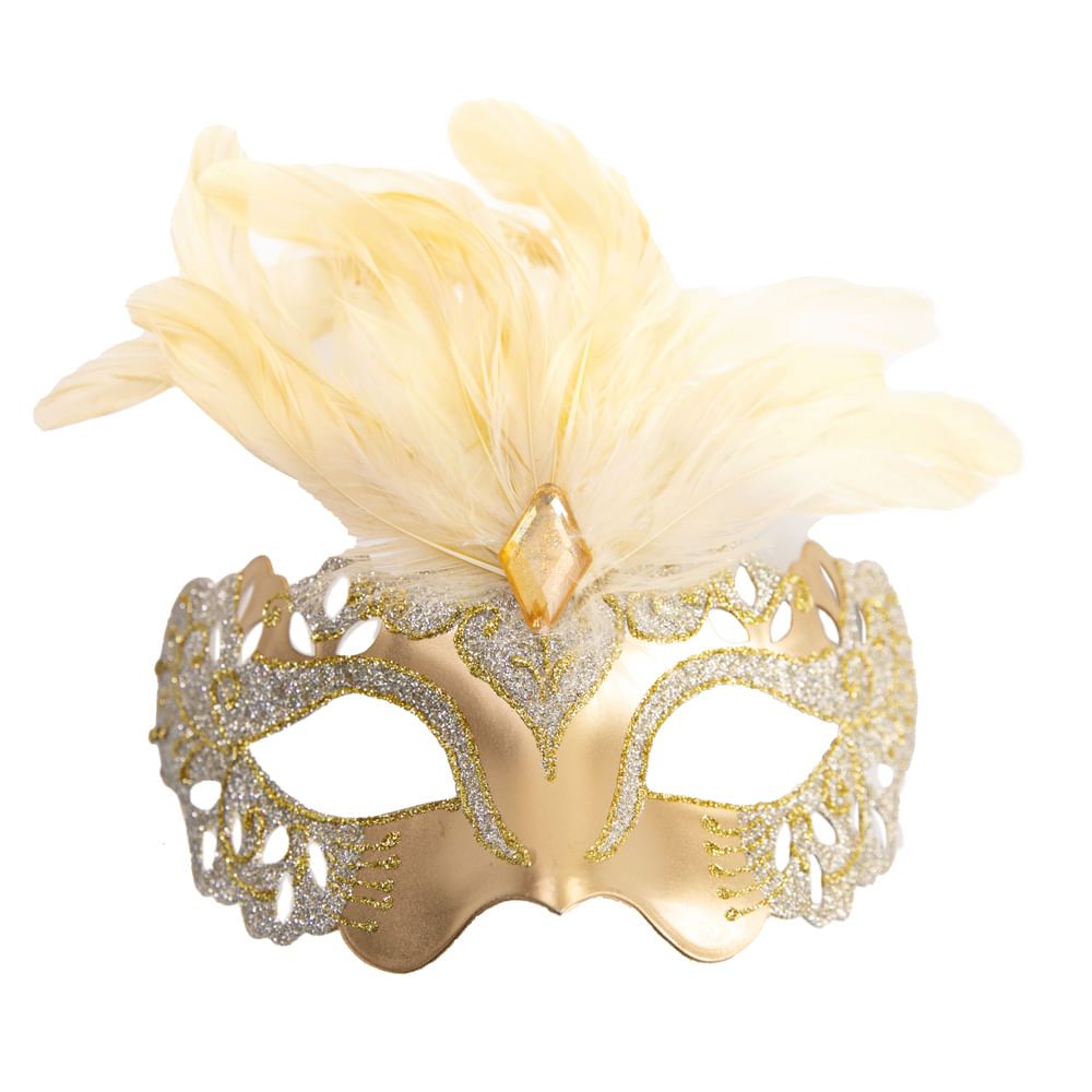 Combine a Máscara Gala Ouro com uma roupa de cor sólida para destacar ainda mais o seu brilho.