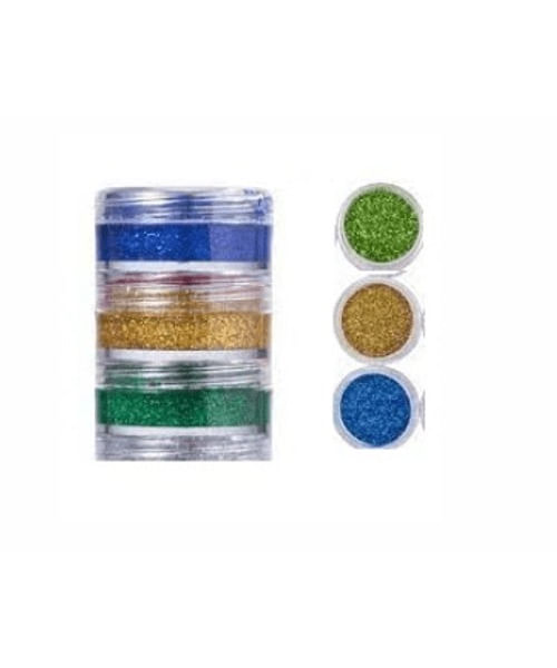 Conjunto de 3 potes de 4gramas cada, nas cores azul, dourado e verde.